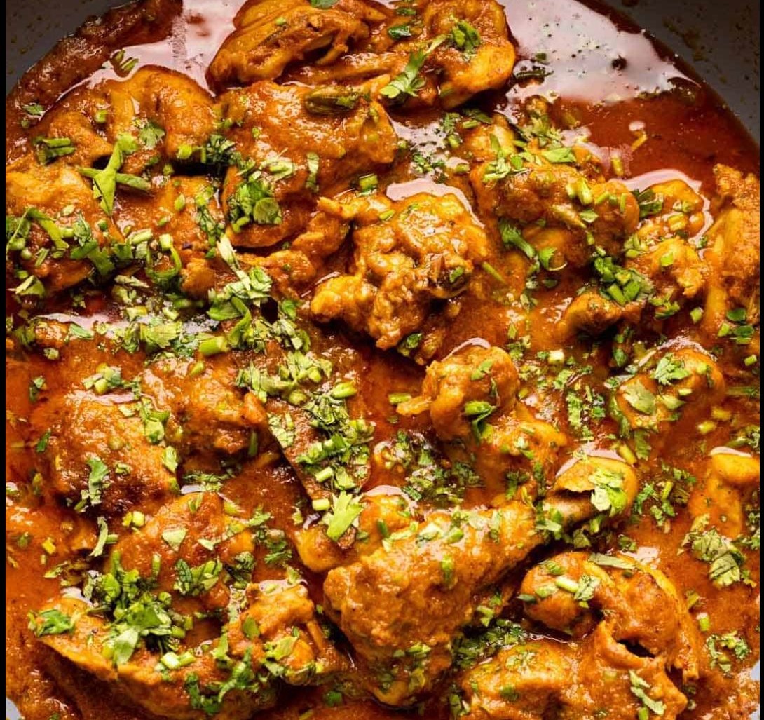 Marinated fresh chicken on the bone, slow cooked in a strong sauce consists of onions, tomatoes, green chilies, fresh herbs and taste special mixed spices with fresh coriander.